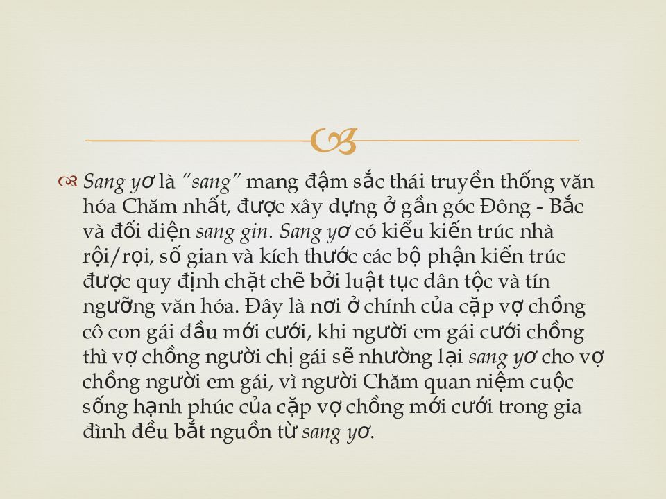 Sang yơ là “sang” mang đậm sắc thái truyền thống văn hóa Chăm nhất, được xây dựng ở gần góc Đông - Bắc và đối diện sang gin. Sang yơ có kiểu kiến trúc nhà rội / rọi, số gian và kích thước các bộ phận kiến trúc được quy định chặt chẽ bởi luật tục dân tộc và tín ngưỡng văn hóa. Đây là nơi ở chính của cặp vợ chồng cô con gái đầu mới cưới, khi người em gái cưới chồng thì vợ chồng người chị gái sẽ nhường lại sang yơ cho vợ chồng người em gái, vì người Chăm quan niệm cuộc sống hạnh phúc của cặp vợ chồng mới cưới trong gia đình đều bắt nguồn từ sang yơ.