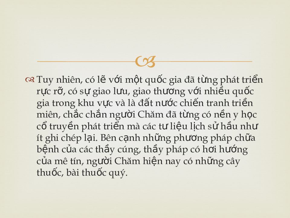 Tuy nhiên, có lẽ với một quốc gia đã từng phát triển rực rỡ, có sự giao lưu, giao thương với nhiều quốc gia trong khu vực và là đất nước chiến tranh triền miên, chắc chắn người Chăm đã từng có nền y học cổ truyền phát triển mà các tư liệu lịch sử hầu như ít ghi chép lại. Bên cạnh những phương pháp chữa bệnh của các thầy cúng, thầy pháp có hơi hướng của mê tín, người Chăm hiện nay có những cây thuốc, bài thuốc quý.