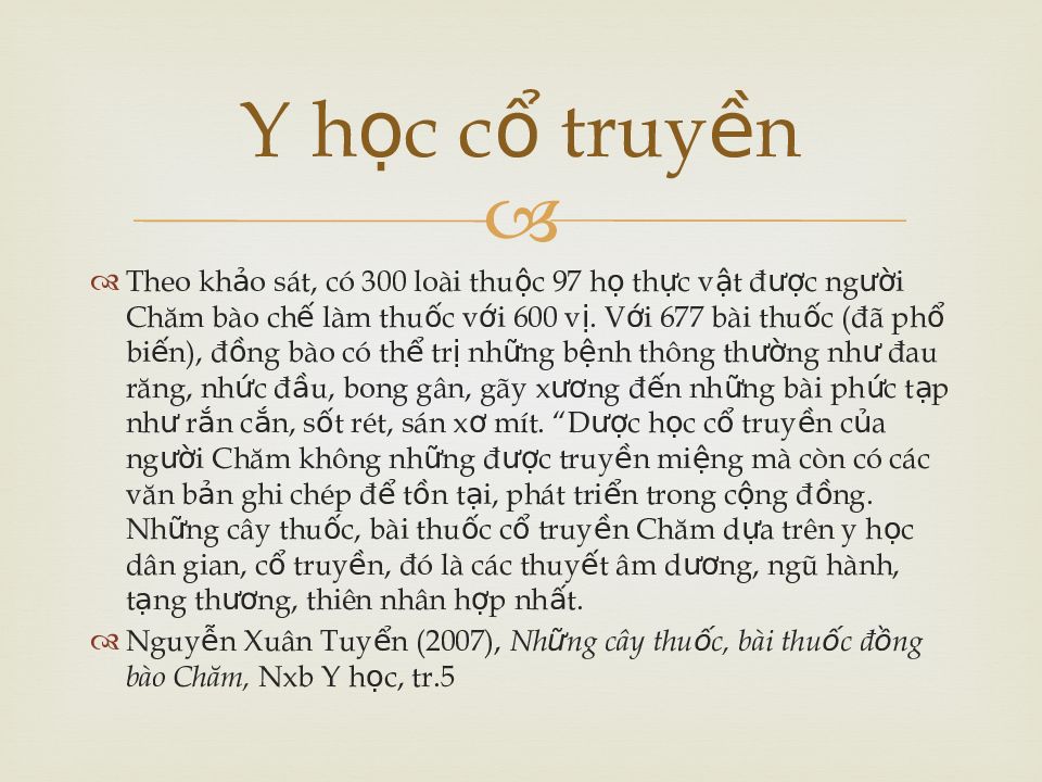 Theo khảo sát, có 300 loài thuộc 97 họ thực vật được người Chăm bào chế làm thuốc với 600 vị. Với 677 bài thuốc ( đã phổ biến ), đồng bào có thể trị những bệnh thông th ường như đau răng, nhức đầu, bong gân, g ãy x ương đến những bài phức tạp như rắn cắn, sốt rét, sán xơ mít. “ Dược học cổ truyền của người Chăm không những được truyền miệng mà còn có các văn bản ghi chép để tồn tại, phát triển trong cộng đồng. Những cây thuốc, bài thuốc cổ truyền Chăm dựa trên y học dân gian, cổ truyền, đó là các thuyết âm dương, ngũ hành, tạng thương, thiên nhân hợp nhất. Nguyễn Xuân Tuyển (2007), Những cây thuốc, bài thuốc đồng bào Chăm, Nxb Y học, tr.5 Y học cổ truyền