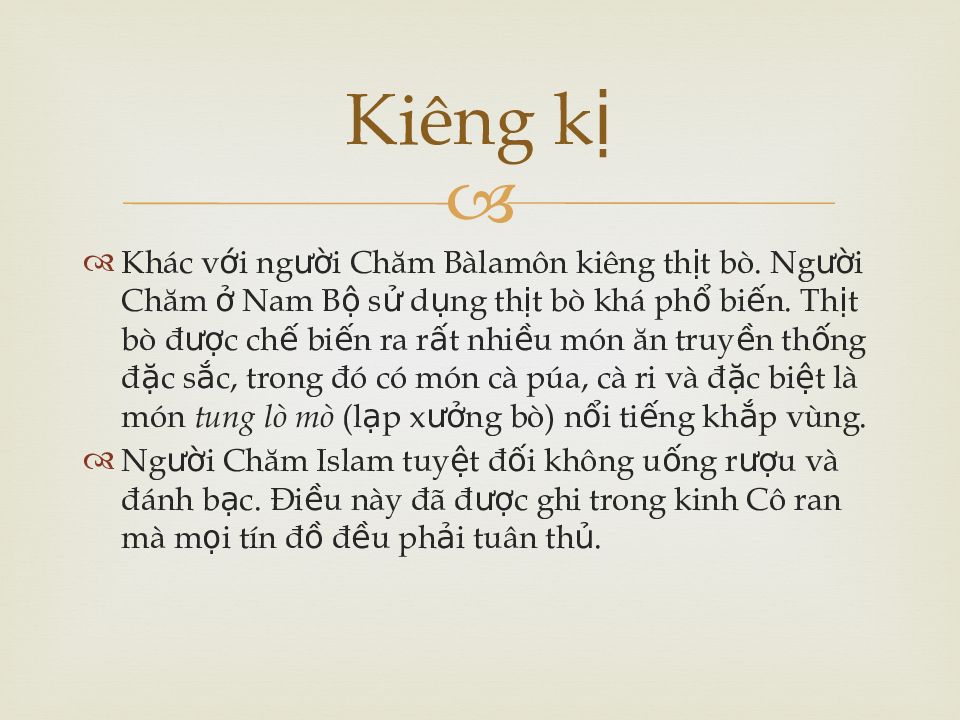 Khác với người Chăm Bàlamôn kiêng thịt bò. Người Chăm ở Nam Bộ sử dụng thịt bò khá phổ biến. Thịt bò được chế biến ra rất nhiều món ăn truyền thống đặc sắc, trong đó có món cà púa, cà ri và đặc biệt là món tung lò mò (lạp xưởng bò) nổi tiếng khắp vùng. Người Chăm Islam tuyệt đối không uống rượu và đánh bạc. Điều này đã được ghi trong kinh Cô ran mà mọi tín đồ đều phải tuân thủ. Kiêng kị