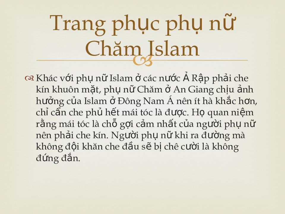 Khác với phụ nữ Islam ở các nước Ả Rập phải che kín khuôn mặt, phụ nữ Chăm ở An Giang chịu ảnh hưởng của Islam ở Đông Nam Á nên ít hà khắc hơn, chỉ cẩn che phủ hết mái tóc là được. Họ quan niệm rằng mái tóc là chỗ gợi cảm nhất của người phụ nữ nên phải che kín. Người phụ nữ khi ra đường mà không đội khăn che đầu sẽ bị chê cười là không đứng đắn. Trang phục phụ nữ Chăm Islam
