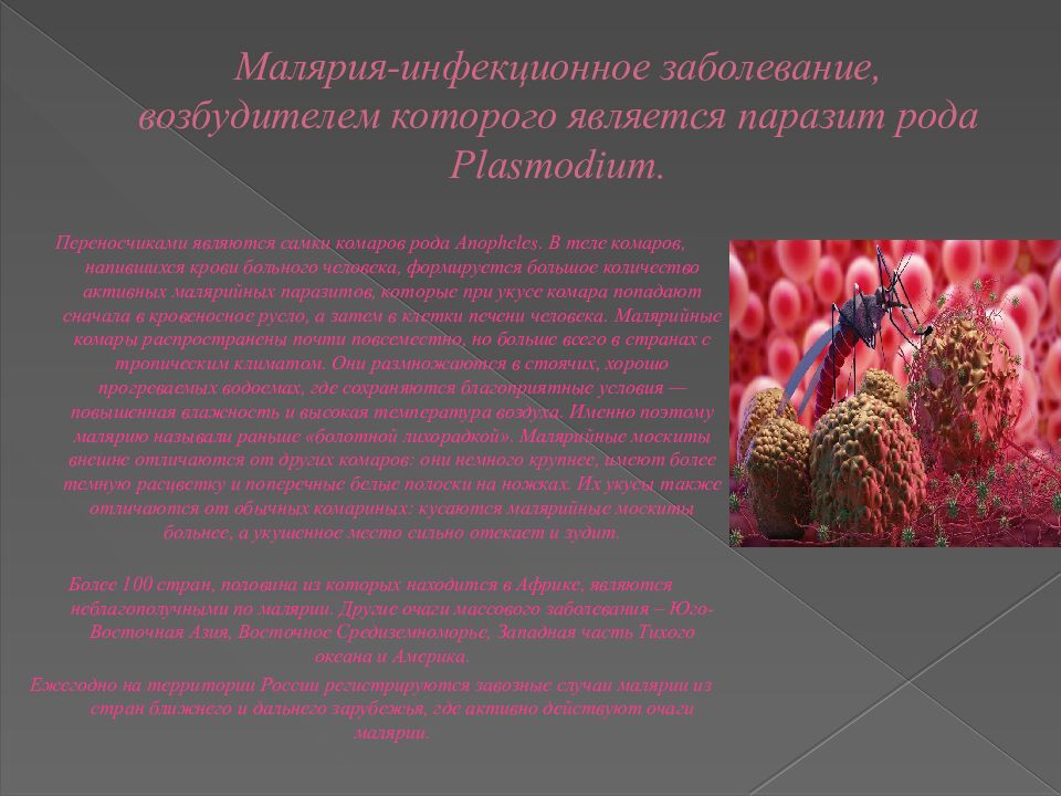 Переносчиками являются самки комаров рода Anopheles. В теле комаров, напившихся крови больного человека, формируется большое количество активных малярийных паразитов, которые при укусе комара попадают сначала в кровеносное русло, а затем в клетки печени человека. Малярийные комары распространены почти повсеместно, но больше всего в странах с тропическим климатом. Они размножаются в стоячих, хорошо прогреваемых водоемах, где сохраняются благоприятные условия — повышенная влажность и высокая температура воздуха. Именно поэтому малярию называли раньше «болотной лихорадкой». Малярийные москиты внешне отличаются от других комаров: они немного крупнее, имеют более темную расцветку и поперечные белые полоски на ножках. Их укусы также отличаются от обычных комариных: кусаются малярийные москиты больнее, а укушенное место сильно отекает и зудит. Более 100 стран, половина из которых находится в Африке, являются неблагополучными по малярии. Другие очаги массового заболевания – Юго-Восточная Азия, Восточное Средиземноморье, Западная часть Тихого океана и Америка. Ежегодно на территории России регистрируются завозные случаи малярии из стран ближнего и дальнего зарубежья, где активно действуют очаги малярии.