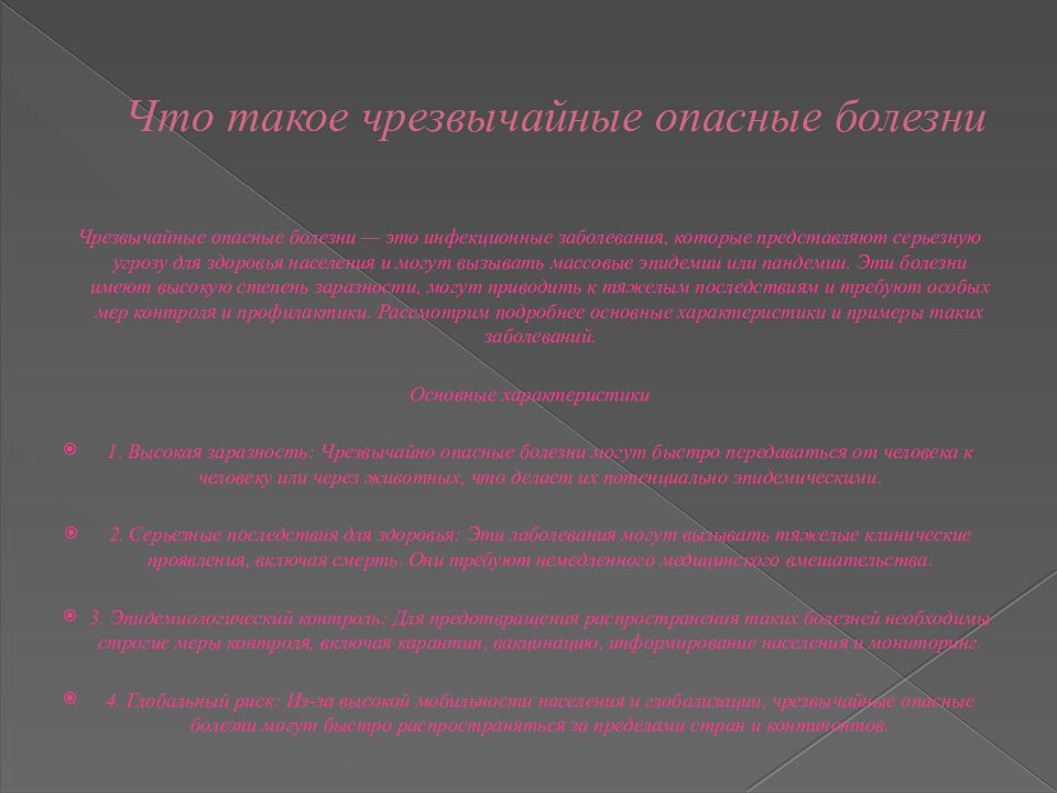 Чрезвычайные опасные болезни — это инфекционные заболевания, которые представляют серьезную угрозу для здоровья населения и могут вызывать массовые эпидемии или пандемии. Эти болезни имеют высокую степень заразности, могут приводить к тяжелым последствиям и требуют особых мер контроля и профилактики. Рассмотрим подробнее основные характеристики и примеры таких заболеваний. Основные характеристики 1. Высокая заразность: Чрезвычайно опасные болезни могут быстро передаваться от человека к человеку или через животных, что делает их потенциально эпидемическими. 2. Серьезные последствия для здоровья: Эти заболевания могут вызывать тяжелые клинические проявления, включая смерть. Они требуют немедленного медицинского вмешательства. 3. Эпидемиологический контроль: Для предотвращения распространения таких болезней необходимы строгие меры контроля, включая карантин, вакцинацию, информирование населения и мониторинг. 4. Глобальный риск: Из-за высокой мобильности населения и глобализации, чрезвычайные опасные болезни могут быстро распространяться за пределами стран и континентов.