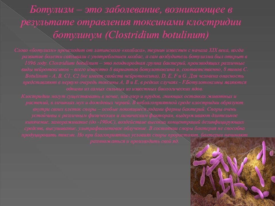 Слово «ботулизм» происходит от латинского «колбаса», термин известен с начала XIX века, когда развитие болезни связывали с употреблением колбас, а сам возбудитель ботулизма был открыт в 1896 году. Clostridium botulinum – это неоднородная группа бактерий, производящих различные виды нейротоксинов – всего известно 8 вариантов ботулотоксина и, соответственно, 8 типов C. Botulinum - А, В, С1, С2 (не имеет свойств нейротоксина ), D, Е, F и G. Для человека опасность представляют в первую очередь токсины А, В и Е, в редких случаях - F.Ботулотоксины являются одними из самых сильных из известных биологических ядов. Клостридии могут существовать в почве, иле озер и прудов, гниющих останках животных и растений, в личинках мух и дождевых червей. В неблагоприятной среде клостридии образуют внутри своих клеток споры – особые покоящиеся годами формы бактерий. Споры очень устойчивы к различным физическим и химическим факторам, выдерживают длительное кипячение, замораживание (до -190оС), воздействие высоких концентраций дезинфицирующих средств, высушивание, ультрафиолетовое облучение. В состоянии споры бактерия не способна продуцировать токсин. Но при благоприятных условиях споры прорастают, бактерии начинают размножаться и производить свой яд.