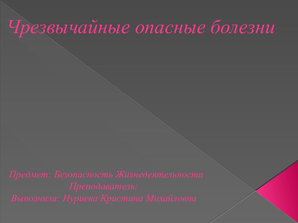 Предмет : Безопасность Жизнедеятельности Преподаватель : Выполнила : Нуриева Кристина Михайловна Чрезвычайные опасные болезни