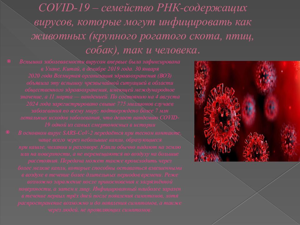 Вспышка заболеваемости вирусом впервые была зафиксирована в Ухане, Китай, в декабре 2019 года. 30 января 2020 года Всемирная организация здравоохранения (ВОЗ) объявила эту вспышку чрезвычайной ситуацией в области общественного здравоохранения, имеющей международное значение, а 11 марта — пандемией. По состоянию на 4 августа 2024 года зарегистрировано свыше 775 миллионов случаев заболевания по всему миру; подтверждено более 7 млн летальных исходов заболевания, что делает пандемию COVID-19 одной из самых смертоносных в истории В основном вирус SARS-CoV-2 передаётся при тесном контакте, чаще всего через небольшие капли, образующиеся при кашле, чихании и разговоре. Капли обычно падают на землю или на поверхности, а не перемещаются по воздуху на большие расстояния. Передача может также происходить через более мелкие капли, которые способны оставаться взвешенными в воздухе в течение более длительных периодов времени. Реже возможно заражение после прикосновения к загрязнённой поверхности, а затем к лицу. Инфицированный наиболее заразен в течение первых трёх дней после появления симптомов, хотя распространение возможно и до появления симптомов, а также через людей, не проявляющих симптомов.