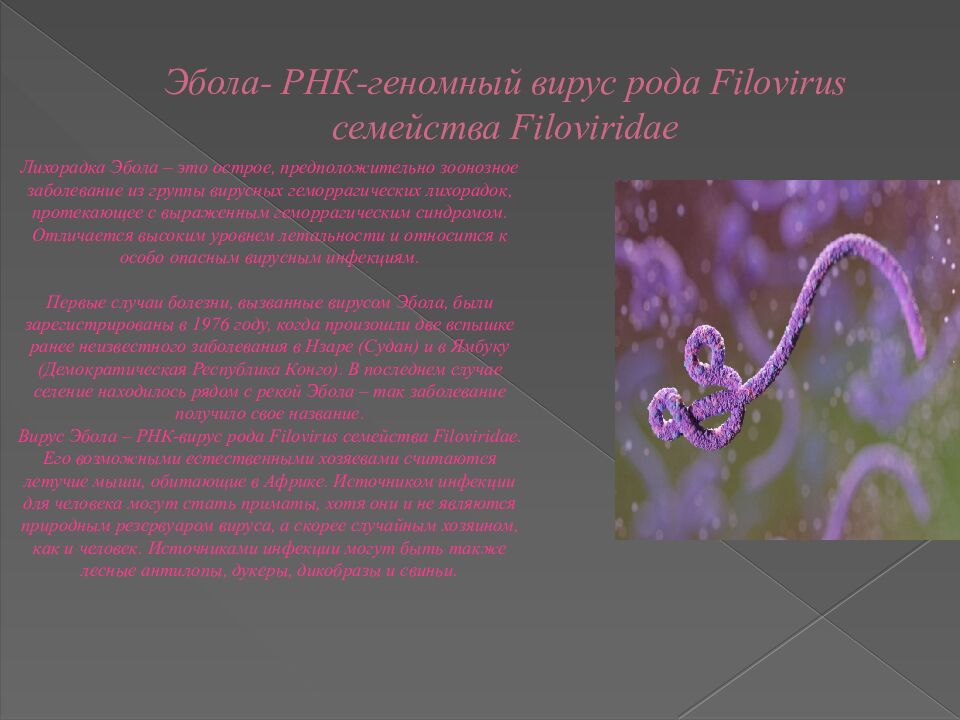 Слайд 4: Эбола - РНК-геномный вирус рода Filovirus семейства Filoviridae