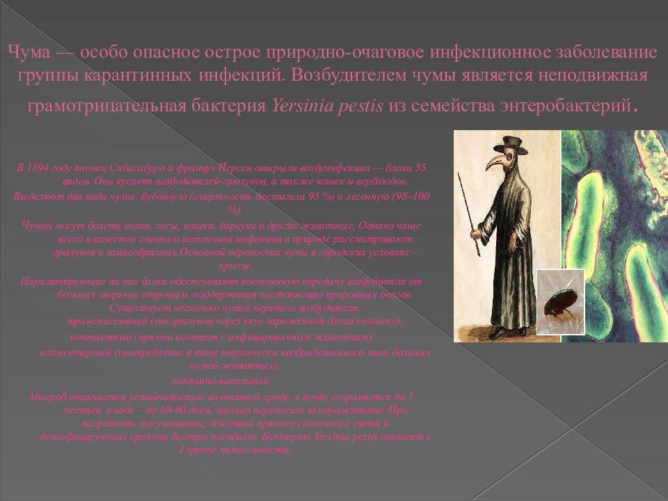 В 1894 году японец Сибасабуро и француз Йерсен открыли возбуинфекции — блохи 55 видов. Они кусают возбудителей-грызунов, а также кошек и верблюдов. Выделяют два вида чумы: бубонную (смертность достигала 95 %) и легочную (98–100 %). Чумой могут болеть волки, лисы, кошки, барсуки и другие животные. Однако чаще всего в качестве главного источника инфекции в природе рассматривают грызунов и зайцеобразных.Основной переносчик чумы в городских условиях – крысы. Паразитирующие на них блохи обеспечивают постоянную передачу возбудителя от больных зверьков здоровым, поддерживая постоянство природных очагов. Существует несколько путей передачи возбудителя: трансмиссивный (от грызунов через укус зараженной блохи человеку); контактный (прямой контакт с инфицированным животным) алиментарный (употребление в пищу термически необработанного мяса больных чумой животных); воздушно-капельный. Микроб отличается устойчивостью во внешней среде: в почве сохраняется до 7 месяцев, в воде – до 30-90 дней, хорошо переносит замораживание. При нагревании, высушивании, действии прямого солнечного света и дезинфицирующих средств быстро погибает. Бактерию Yersinia pestis относят к I группе патогенности.