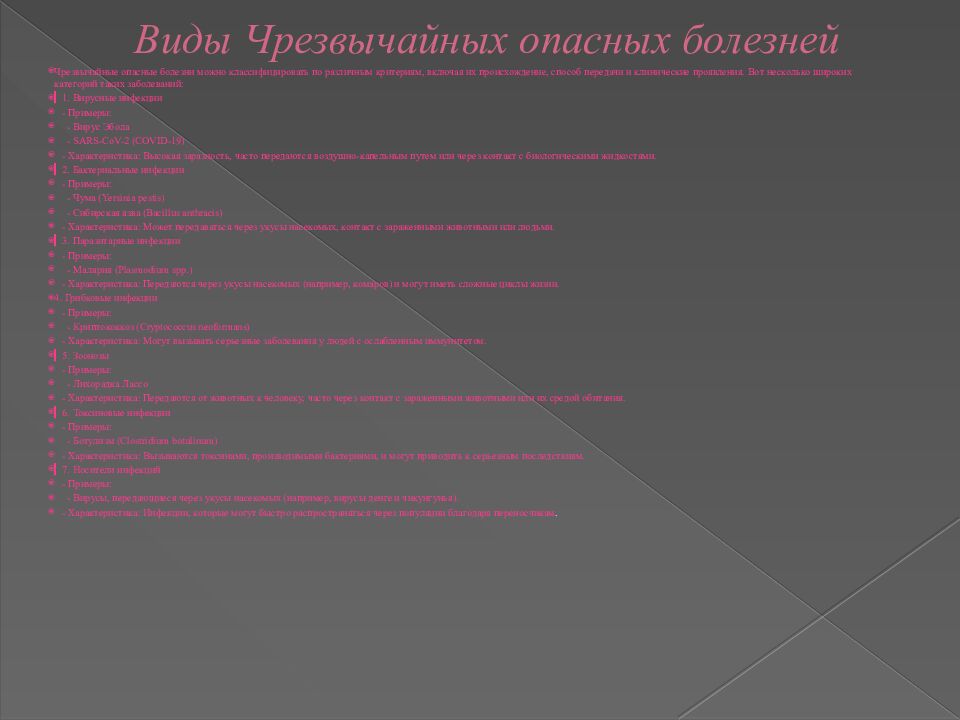 Чрезвычайные опасные болезни можно классифицировать по различным критериям, включая их происхождение, способ передачи и клинические проявления. Вот несколько широких категорий таких заболеваний: ▎1. Вирусные инфекции - Примеры: - Вирус Эбола - SARS-CoV-2 (COVID-19) - Характеристика: Высокая заразность, часто передаются воздушно-капельным путем или через контакт с биологическими жидкостями. ▎2. Бактериальные инфекции - Примеры: - Чума ( Yersinia pestis ) - Сибирская язва ( Bacillus anthracis ) - Характеристика: Может передаваться через укусы насекомых, контакт с зараженными животными или людьми. ▎3. Паразитарные инфекции - Примеры: - Малярия ( Plasmodium spp.) - Характеристика: Передаются через укусы насекомых (например, комаров) и могут иметь сложные циклы жизни. 4. Грибковые инфекции - Примеры: - Криптококкоз ( Cryptococcus neoformans ) - Характеристика: Могут вызывать серьезные заболевания у людей с ослабленным иммунитетом. ▎5. Зоонозы - Примеры: - Лихорадка Лассо - Характеристика: Передаются от животных к человеку, часто через контакт с зараженными животными или их средой обитания. ▎6. Токсиновые инфекции - Примеры: - Ботулизм ( Clostridium botulinum ) - Характеристика: Вызываются токсинами, производимыми бактериями, и могут приводить к серьезным последствиям. ▎7. Носители инфекций - Примеры: - Вирусы, передающиеся через укусы насекомых (например, вирусы денге и чикунгунья ). - Характеристика: Инфекции, которые могут быстро распространяться через популяции благодаря переносчикам.