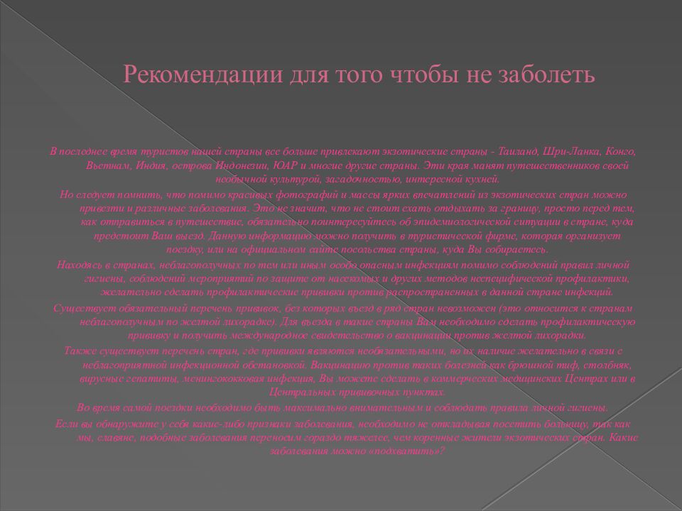 В последнее время туристов нашей страны все больше привлекают экзотические страны - Таиланд, Шри-Ланка, Конго, Вьетнам, Индия, острова Индонезии, ЮАР и многие другие страны. Эти края манят путешественников своей необычной культурой, загадочностью, интересной кухней. Но следует помнить, что помимо красивых фотографий и массы ярких впечатлений из экзотических стран можно привезти и различные заболевания. Это не значит, что не стоит ехать отдыхать за границу, просто перед тем, как отправиться в путешествие, обязательно поинтересуйтесь об эпидемиологической ситуации в стране, куда предстоит Ваш выезд. Данную информацию можно получить в туристической фирме, которая организует поездку, или на официальном сайте посольства страны, куда Вы собираетесь. Находясь в странах, неблагополучных по тем или иным особо опасным инфекциям помимо соблюдений правил личной гигиены, соблюдений мероприятий по защите от насекомых и других методов неспецифической профилактики, желательно сделать профилактические прививки против распространенных в данной стране инфекций. Существует обязательный перечень прививок, без которых въезд в ряд стран невозможен (это относится к странам неблагополучным по желтой лихорадке). Для въезда в такие страны Вам необходимо сделать профилактическую прививку и получить международное свидетельство о вакцинации против желтой лихорадки. Также существует перечень стран, где прививки являются необязательными, но их наличие желательно в связи с неблагоприятной инфекционной обстановкой. Вакцинацию против таких болезней как брюшной тиф, столбняк, вирусные гепатиты, менингококковая инфекция, Вы можете сделать в коммерческих медицинских Центрах или в Центральных прививочных пунктах. Во время самой поездки необходимо быть максимально внимательным и соблюдать правила личной гигиены. Если вы обнаружите у себя какие-либо признаки заболевания, необходимо не откладывая посетить больницу, так как мы, славяне, подобные заболевания переносим гораздо тяжелее, чем коренные жители экзотических стран. Какие заболевания можно «подхватить»?