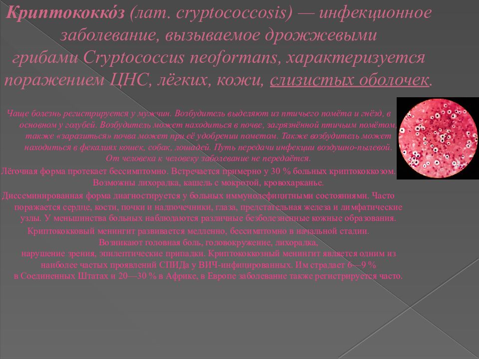 Слайд 9: Криптококко́з (лат. cryptococcosis ) — инфекционное заболевание, вызываемое дрожжевыми грибами Cryptococcus neoformans, характеризуется поражением ЦНС, лёгких, кожи, слизистых оболочек