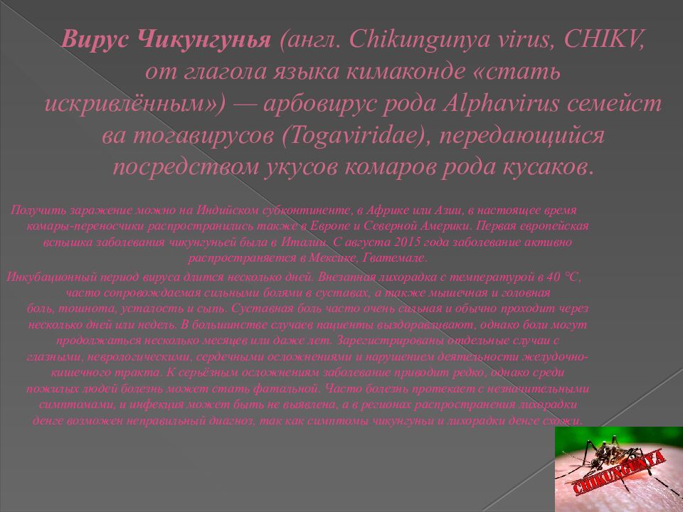 Слайд 12: Вирус Чикунгунья (англ. Chikungunya virus, CHIKV, от глагола языка кимаконде «стать искривлённым ») — арбовирус рода Alphavirus семейства тогавирусов ( Togaviridae ), передающийся посредством укусов комаров рода кусаков