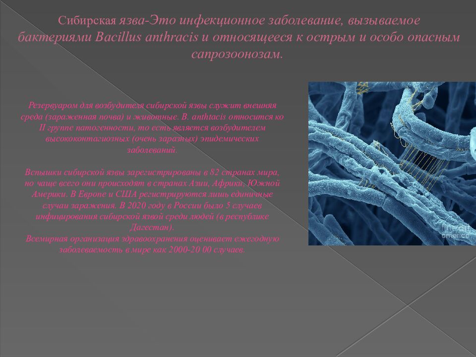 Слайд 7: Сибирская язва-Это инфекционное заболевание, вызываемое бактериями Bacillus anthracis и относящееся к острым и особо опасным сапрозоонозам