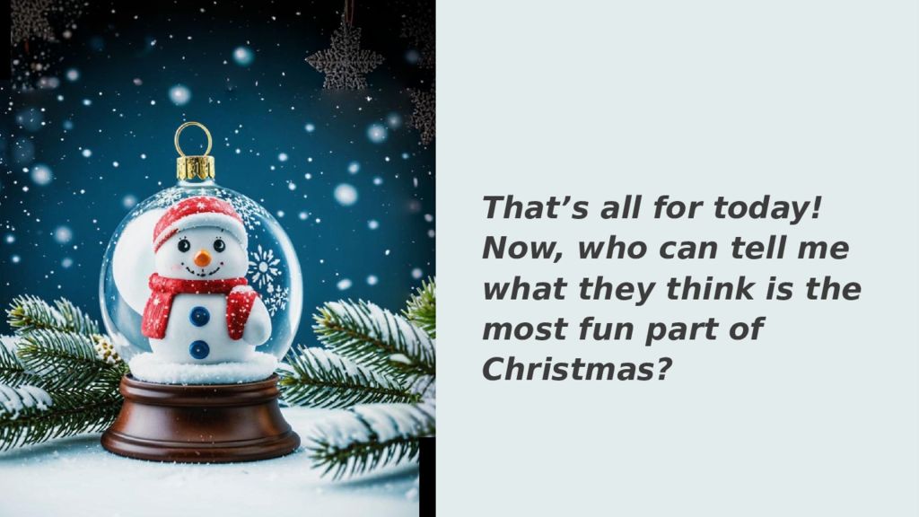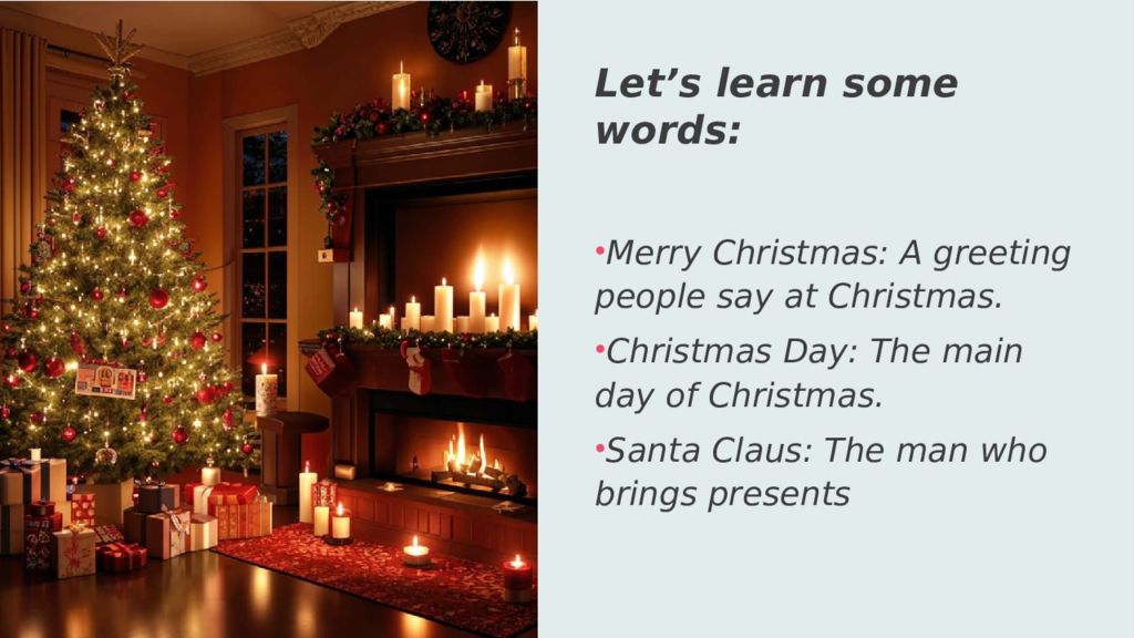 Merry Christmas: A greeting people say at Christmas. Christmas Day: The main day of Christmas. Santa Claus: The man who brings presents
