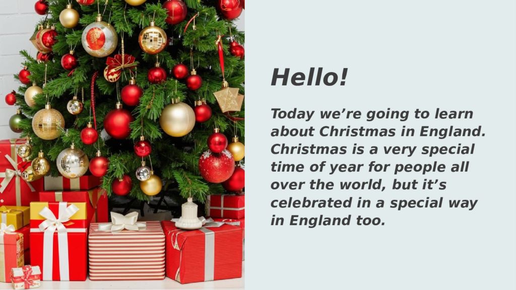 Today we’re going to learn about Christmas in England. Christmas is a very special time of year for people all over the world, but it’s celebrated in a special way in England too.