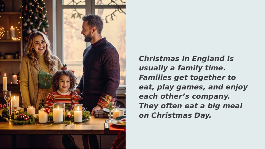 Christmas in England is usually a family time. Families get together to eat, play games, and enjoy each other’s company. They often eat a big meal on Christmas Day.