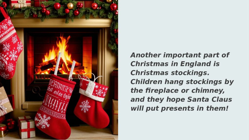Another important part of Christmas in England is Christmas stockings. Children hang stockings by the fireplace or chimney, and they hope Santa Claus will put presents in them!