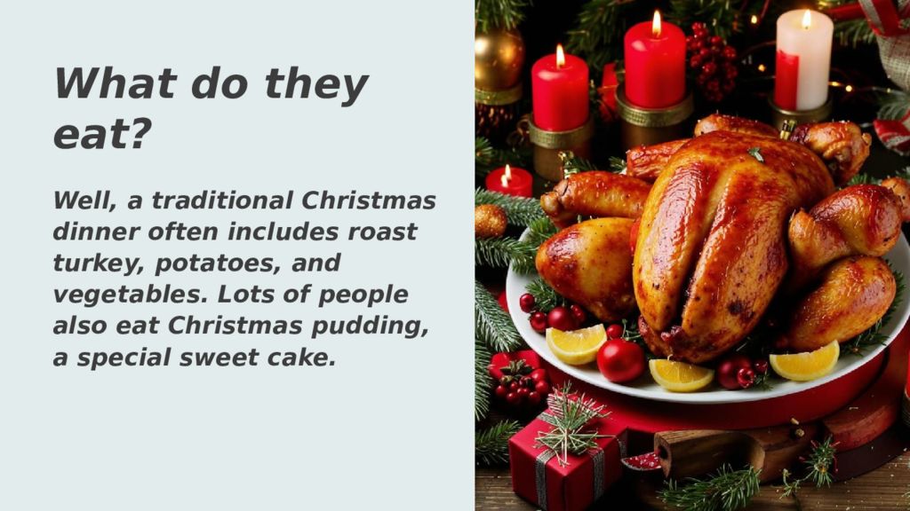 Well, a traditional Christmas dinner often includes roast turkey, potatoes, and vegetables. Lots of people also eat Christmas pudding, a special sweet cake.