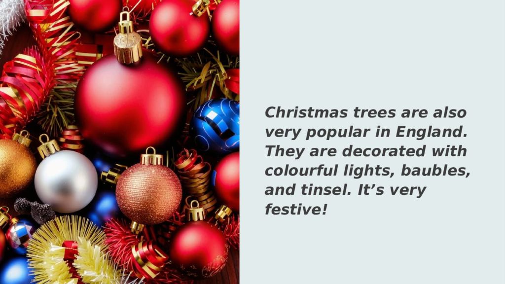 Christmas trees are also very popular in England. They are decorated with colourful lights, baubles, and tinsel. It’s very festive!