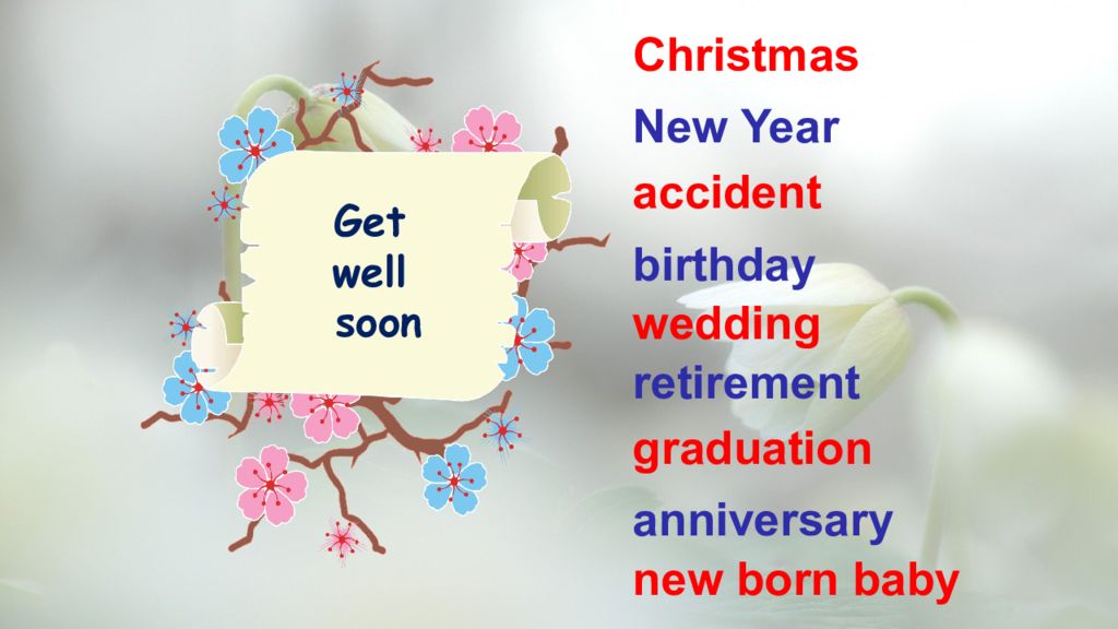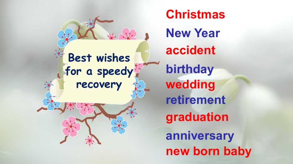 Christmas New Year accident birthday wedding retirement graduation anniversary new born baby Best wishes for a speedy recovery
