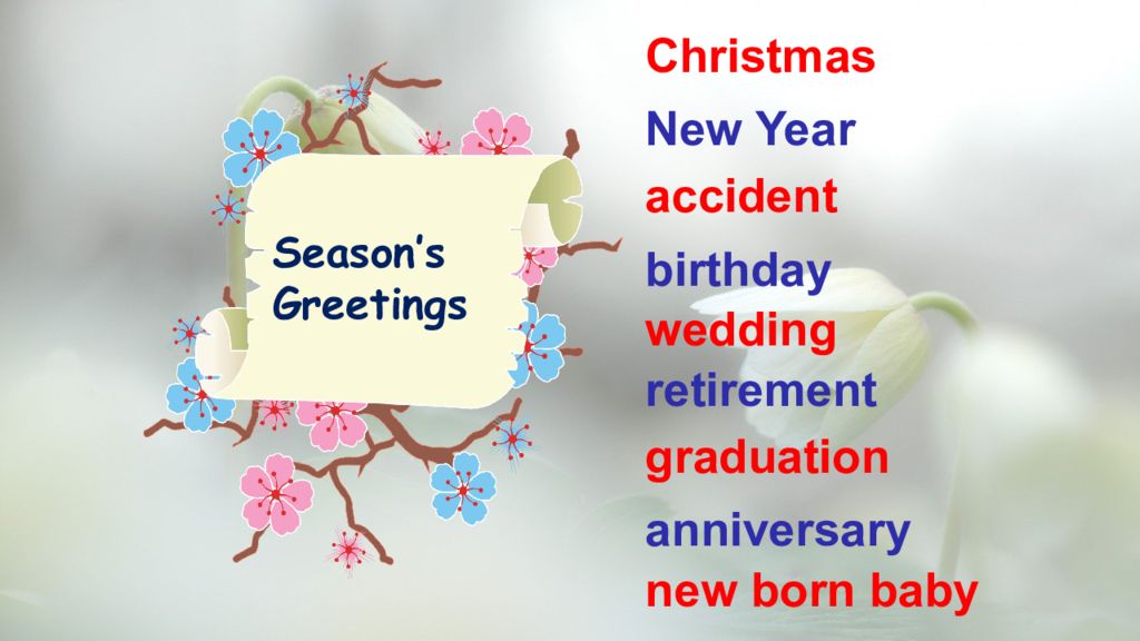 Christmas New Year accident birthday wedding retirement graduation anniversary new born baby Season’s Greetings