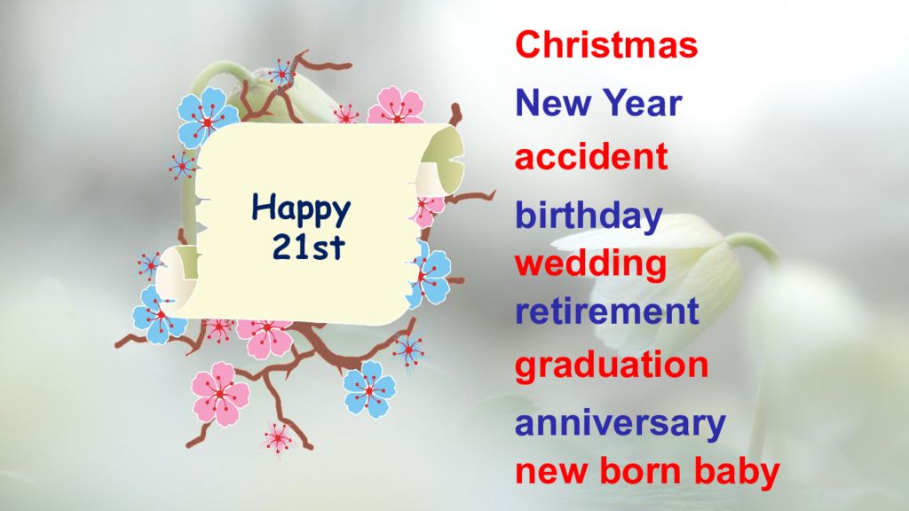 Christmas New Year accident birthday wedding retirement graduation anniversary new born baby Happy 21st