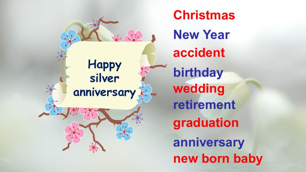 Christmas New Year accident birthday wedding retirement graduation anniversary new born baby Happy silver anniversary