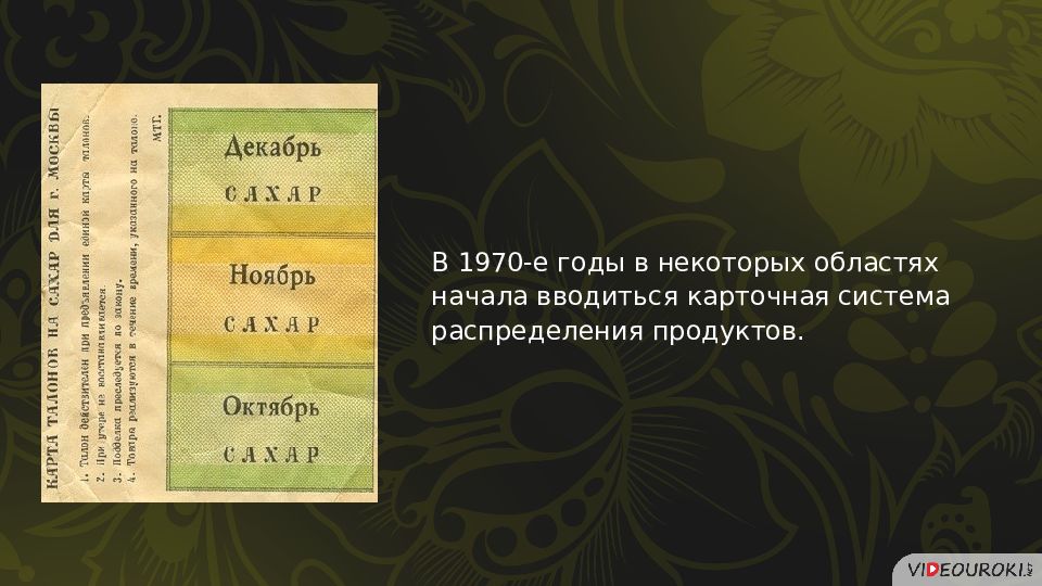 В 1970-е годы в некоторых областях начала вводиться карточная система распределения продуктов.
