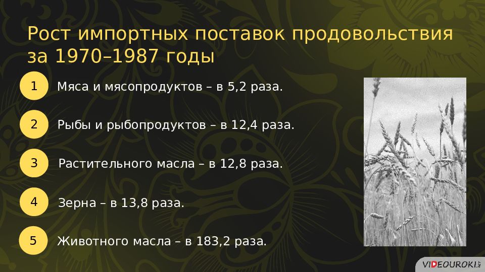 Рост импортных поставок продовольствия за 1970–1987 годы Мяса и мясопродуктов – в 5,2 раза. 1 2 4 Рыбы и рыбопродуктов – в 12,4 раза. Зерна – в 13,8 раза. 3 Растительного масла – в 12,8 раза. 5 Животного масла – в 183,2 раза.