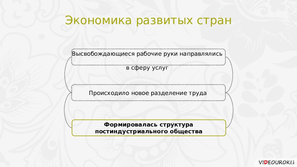 Высвобождающиеся рабочие руки направлялись в сферу услуг Происходило новое разделение труда Формировалась структура постиндустриального общества Экономика развитых стран