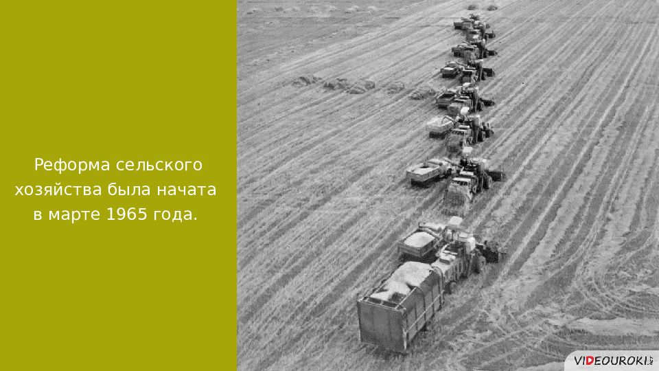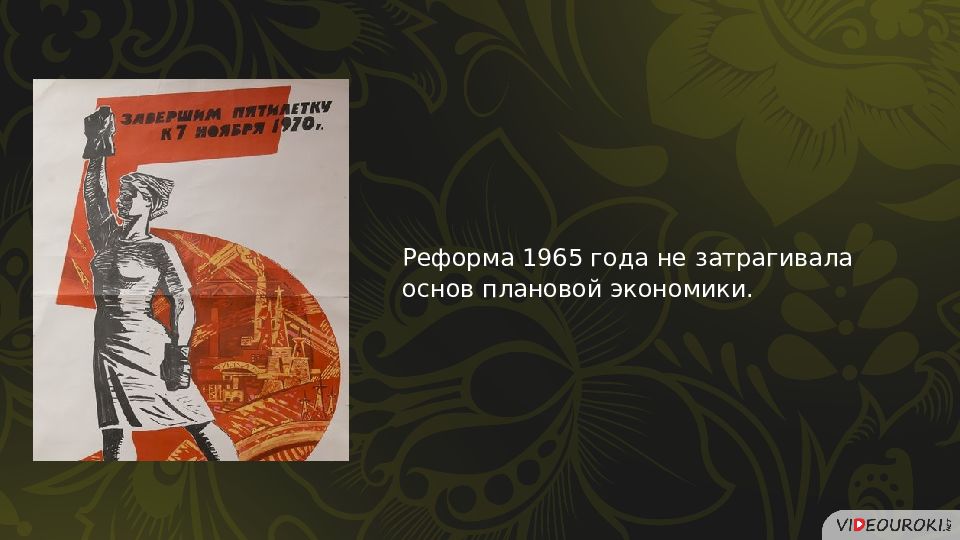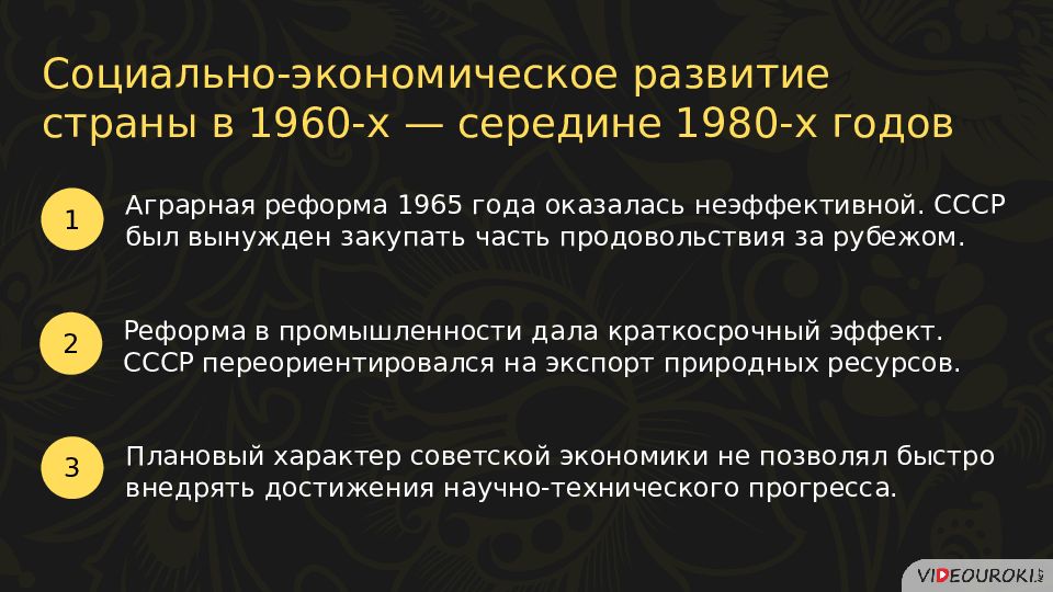 Социально-экономическое развитие страны в 1960-х — середине 1980-х годов Аграрная реформа 1965 года оказалась неэффективной. СССР был вынужден закупать часть продовольствия за рубежом. 1 2 Реформа в промышленности дала краткосрочный эффект. СССР переориентировался на экспорт природных ресурсов. 3 Плановый характер советской экономики не позволял быстро внедрять достижения научно-технического прогресса.