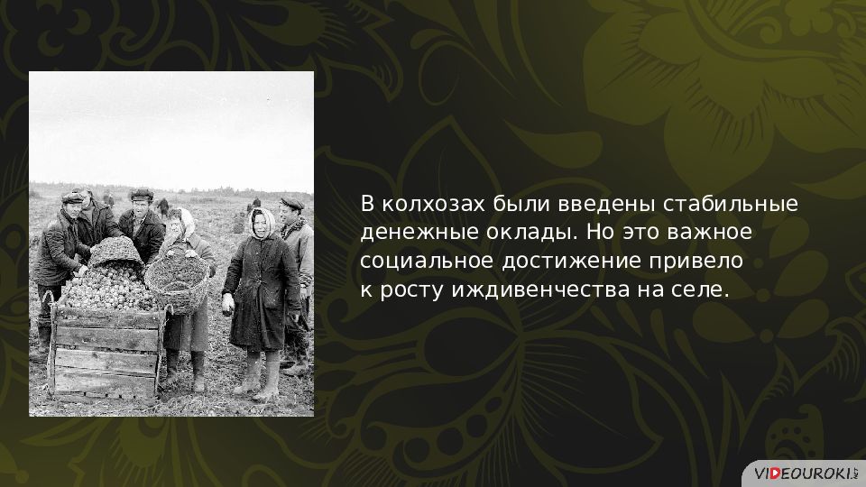 В колхозах были введены стабильные денежные оклады. Но это важное социальное достижение привело к росту иждивенчества на селе.