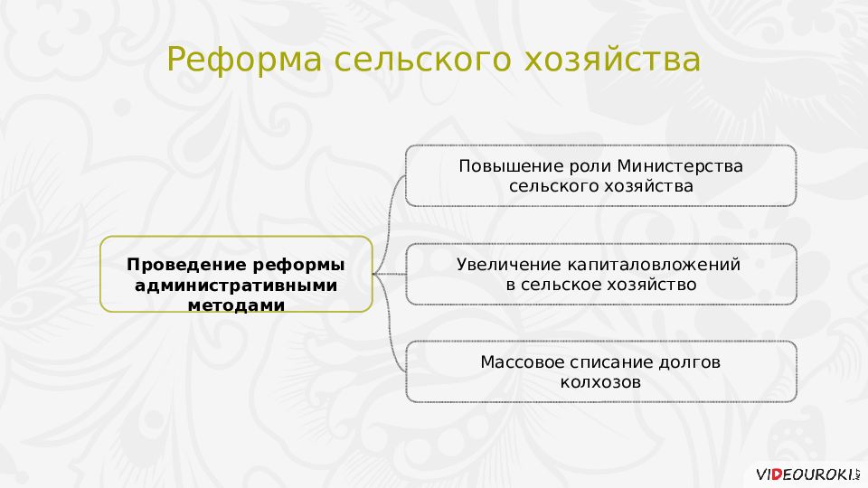 Проведение реформы административными методами Повышение роли Министерства сельского хозяйства Увеличение капиталовложений в сельское хозяйство Массовое списание долгов колхозов Реформа сельского хозяйства