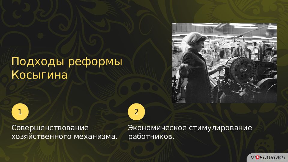 Подходы реформы Косыгина Совершенствование хозяйственного механизма. 1 Экономическое стимулирование работников. 2