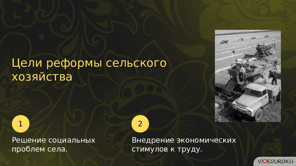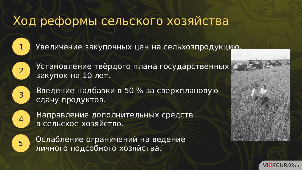 Ход реформы сельского хозяйства Увеличение закупочных цен на сельхозпродукцию. 1 2 4 Установление твёрдого плана государственных закупок на 10 лет. Направление дополнительных средств в сельское хозяйство. 3 Введение надбавки в 50 % за сверхплановую сдачу продуктов. 5 Ослабление ограничений на ведение личного подсобного хозяйства.