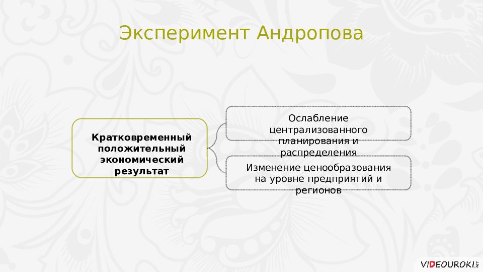 Эксперимент Андропова Кратковременный положительный экономический результат Ослабление централизованного планирования и распределения Изменение ценообразования на уровне предприятий и регионов