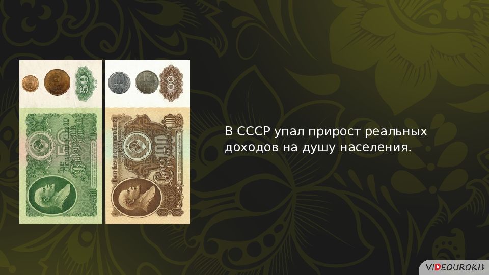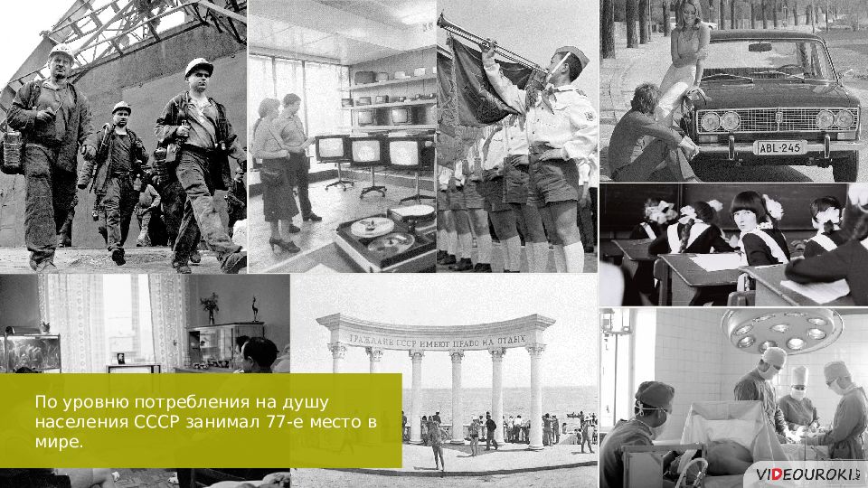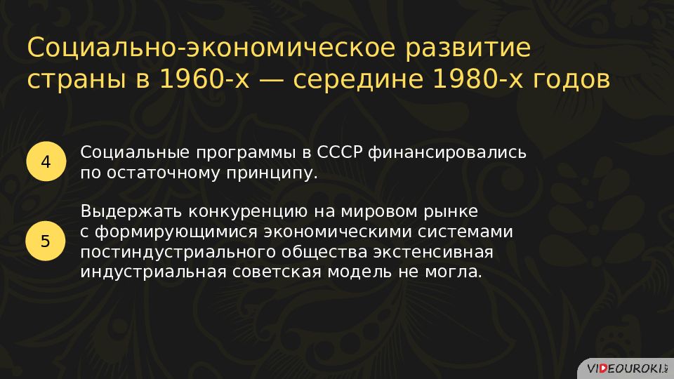 Социальные программы в СССР финансировались по остаточному принципу. 4 5 Выдержать конкуренцию на мировом рынке с формирующимися экономическими системами постиндустриального общества экстенсивная индустриальная советская модель не могла. Социально-экономическое развитие страны в 1960-х — середине 1980-х годов