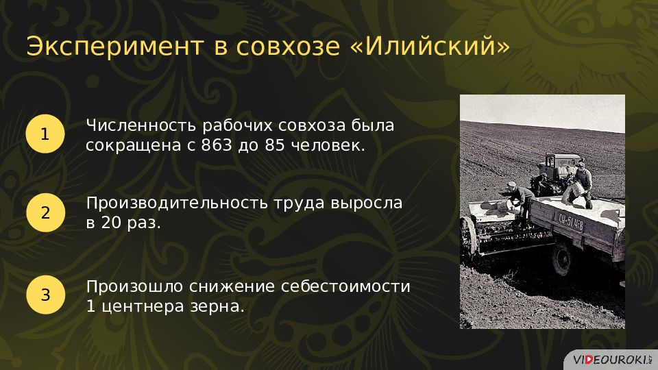 Эксперимент в совхозе « Илийский » Численность рабочих совхоза была сокращена с 863 до 85 человек. 1 2 Производительность труда выросла в 20 раз. 3 Произошло снижение себестоимости 1 центнера зерна.