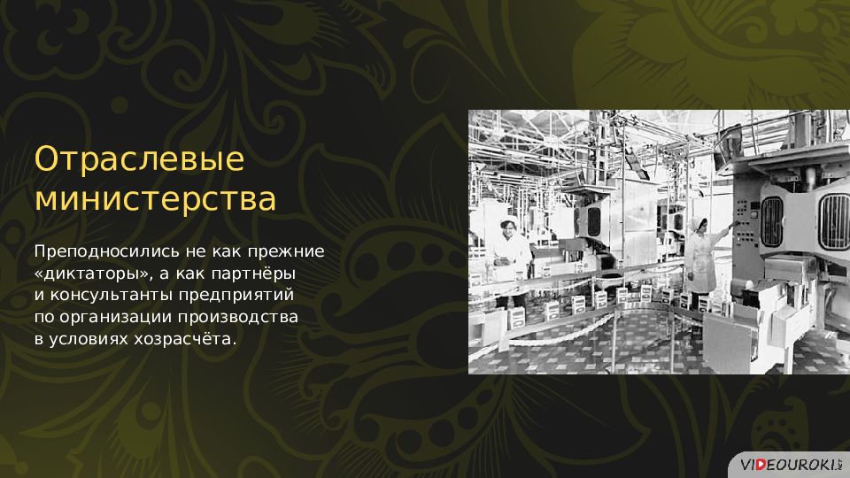 Отраслевые министерства Преподносились не как прежние «диктаторы», а как партнёры и консультанты предприятий по организации производства в условиях хозрасчёта.