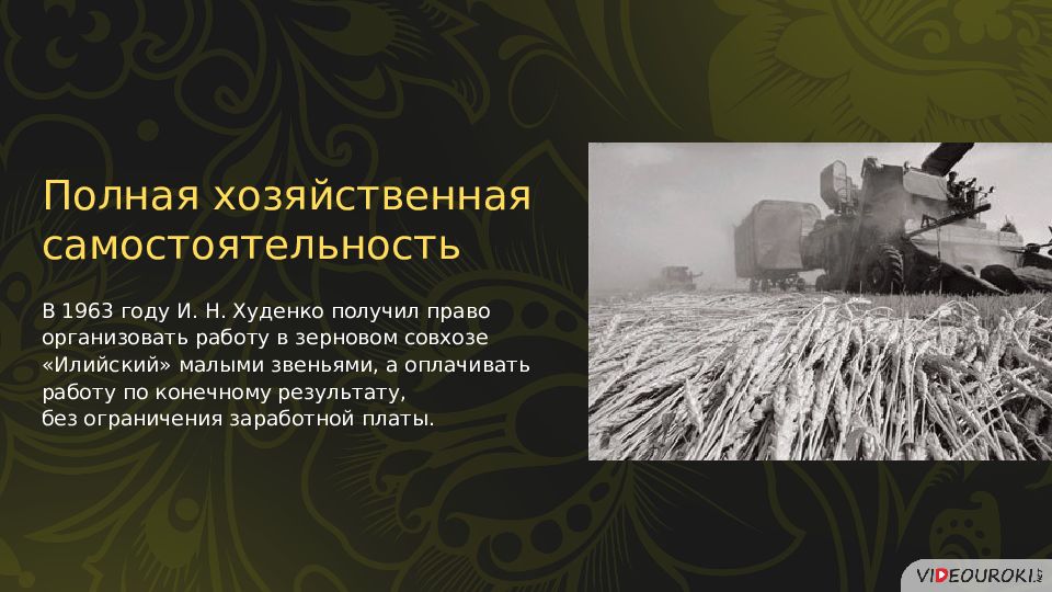 Полная хозяйственная самостоятельность В 1963 году И. Н. Худенко получил право организовать работу в зерновом совхозе « Илийский » малыми звеньями, а оплачивать работу по конечному результату, без ограничения заработной платы.