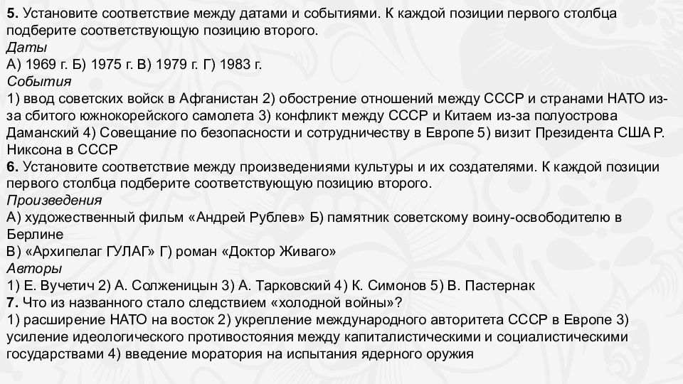 5. Установите соответствие между датами и событиями. К каждой позиции первого столбца подберите соответствующую позицию второго. Даты А) 1969 г. Б) 1975 г. В) 1979 г. Г) 1983 г. События 1) ввод советских войск в Афганистан 2) обострение отношений между СССР и странами НАТО из-за сбитого южнокорейского самолета 3) конфликт между СССР и Китаем из-за полуострова Даманский 4) Совещание по безопасности и сотрудничеству в Европе 5) визит Президента США Р. Никсона в СССР 6. Установите соответствие между произведениями культуры и их создателями. К каждой позиции первого столбца подберите соответствующую позицию второго. Произведения А) художественный фильм «Андрей Рублев» Б) памятник советскому воину-освободителю в Берлине В) «Архипелаг ГУЛАГ» Г) роман «Доктор Живаго» Авторы 1) Е. Вучетич 2) А. Солженицын 3) А. Тарковский 4) К. Симонов 5) В. Пастернак 7. Что из названного стало следствием «холодной войны»? 1) расширение НАТО на восток 2) укрепление международного авторитета СССР в Европе 3) усиление идеологического противостояния между капиталистическими и социалистическими государствами 4) введение моратория на испытания ядерного оружия