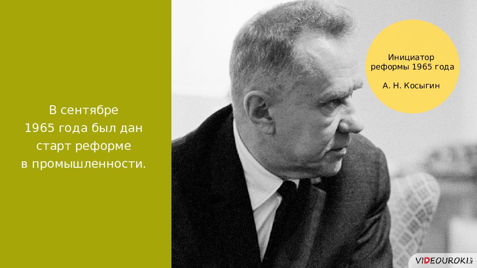 В сентябре 1965 года был дан старт реформе в промышленности. Инициатор реформы 1965 года А. Н. Косыгин