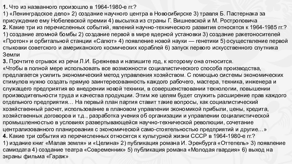1. Что из названного произошло в 1964-1980-е гг.? 1) «Ленинградское дело» 2) создание научного центра в Новосибирске 3) травля Б. Пастернака за присуждение ему Нобелевской премии 4) высылка из страны Г. Вишневской и М. Ростроповича 2. Какие три из перечисленных событий, явлений научно-технического развития относятся к 1964-1985 гг.? 1) создание атомной бомбы 2) создание первой в мире ядерной установки 3) создание ракетоносителей «Протон» и орбитальной станции «Салют» 4) появление новой науки — генетики 5) осуществление первой стыковки советского и американского космических кораблей 6) запуск первого искусственного спутника Земли 3. Прочтите отрывок из речи Л.И. Брежнева и напишите год, к которому она относится. «Чтобы в полной мере использовать все возможности социалистического способа производства, предлагается усилить экономический метод управления хозяйством. С помощью системы экономических стимулов нужно создать прямую заинтересованность каждого рабочего, мастера, техника, инженера и служащего предприятия во внедрении новой техники, в совершенствовании технологии, повышении производительности труда и качества продукции. Этим же целям будет служить расширение прав каждого отдельного предприятия… На первый план партия ставит такие вопросы, как социалистический хозяйственный расчет, использование в плановом управлении экономикой прибыли, цены, кредита, хозяйственных договоров и т.д., разработка учения об организации и управлении социалистической промышленностью в условиях развертывающейся научно-технической революции, сочетание централизованного планирования с экономической само- стоятельностью предприятий и другие…» 4. Какие три события из перечисленных относятся к культурной жизни СССР в 1964-1980-е гг.? 1) издание книг «Малая земля» и «Целина» 2) публикация романа И. Эренбурга «Оттепель» 3) появление самиздата 4) создание театра «Современник» 5) публикация романа «Молодая гвардия» 6) выход на экраны фильма «Гараж»