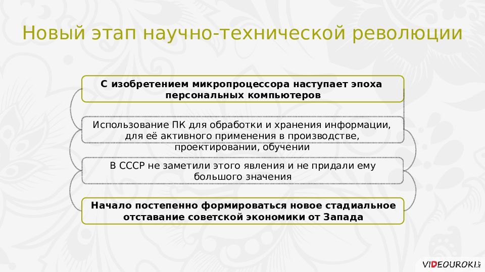 С изобретением микропроцессора наступает эпоха персональных компьютеров Использование ПК для обработки и хранения информации, для её активного применения в производстве, проектировании, обучении В СССР не заметили этого явления и не придали ему большого значения Начало постепенно формироваться новое стадиальное отставание советской экономики от Запада Новый этап научно-технической революции
