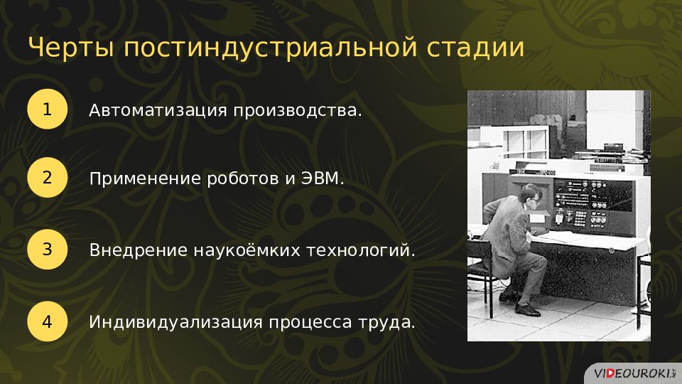 Черты постиндустриальной стадии Автоматизация производства. 1 2 Применение роботов и ЭВМ. 3 Внедрение наукоёмких технологий. 4 Индивидуализация процесса труда.
