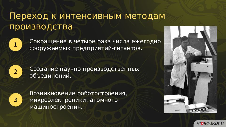 Переход к интенсивным методам производства Сокращение в четыре раза числа ежегодно сооружаемых предприятий-гигантов. 1 2 Создание научно-производственных объединений. 3 Возникновение роботостроения, микроэлектроники, атомного машиностроения.
