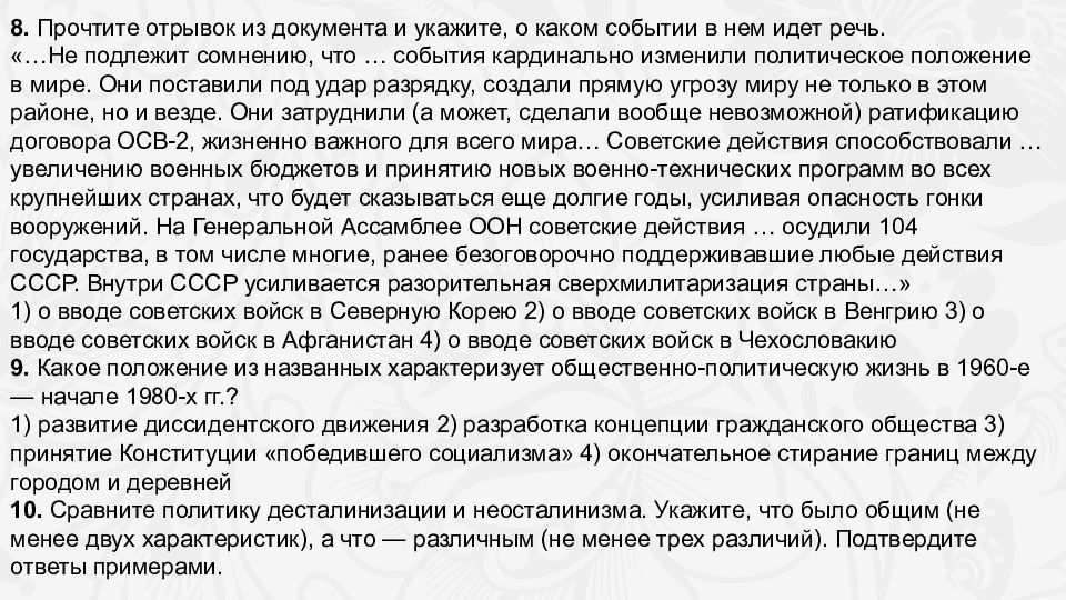 8. Прочтите отрывок из документа и укажите, о каком событии в нем идет речь. «…Не подлежит сомнению, что … события кардинально изменили политическое положение в мире. Они поставили под удар разрядку, создали прямую угрозу миру не только в этом районе, но и везде. Они затруднили (а может, сделали вообще невозможной) ратификацию договора ОСВ-2, жизненно важного для всего мира… Советские действия способствовали … увеличению военных бюджетов и принятию новых военно-технических программ во всех крупнейших странах, что будет сказываться еще долгие годы, усиливая опасность гонки вооружений. На Генеральной Ассамблее ООН советские действия … осудили 104 государства, в том числе многие, ранее безоговорочно поддерживавшие любые действия СССР. Внутри СССР усиливается разорительная сверхмилитаризация страны…» 1) о вводе советских войск в Северную Корею 2) о вводе советских войск в Венгрию 3) о вводе советских войск в Афганистан 4) о вводе советских войск в Чехословакию 9. Какое положение из названных характеризует общественно-политическую жизнь в 1960-е — начале 1980-х гг.? 1) развитие диссидентского движения 2) разработка концепции гражданского общества 3) принятие Конституции «победившего социализма» 4) окончательное стирание границ между городом и деревней 10. Сравните политику десталинизации и неосталинизма. Укажите, что было общим (не менее двух характеристик), а что — различным (не менее трех различий). Подтвердите ответы примерами.