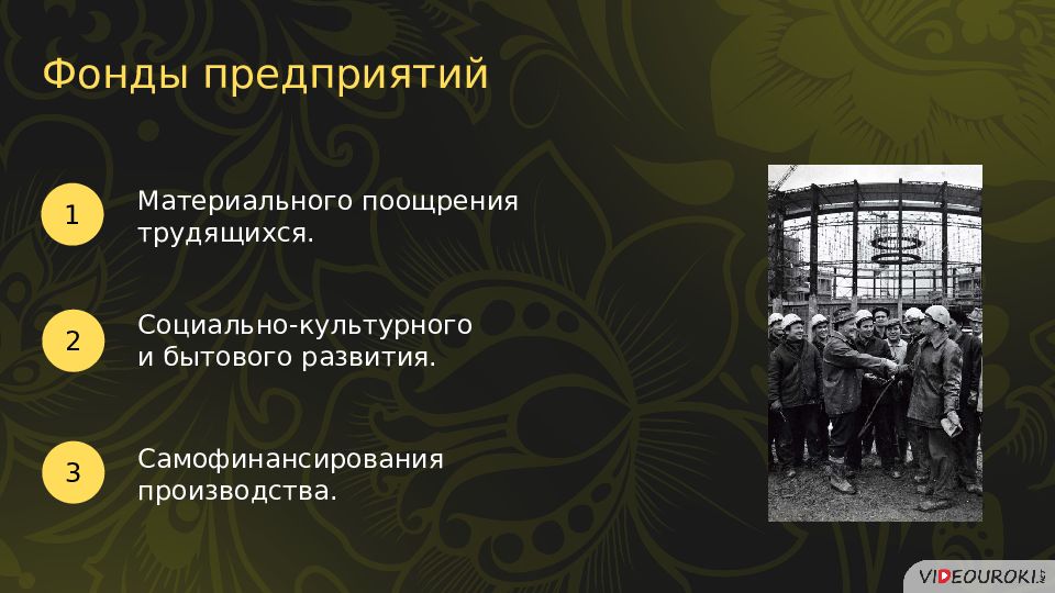 Фонды предприятий Материального поощрения трудящихся. 1 2 Социально-культурного и бытового развития. 3 Самофинансирования производства.