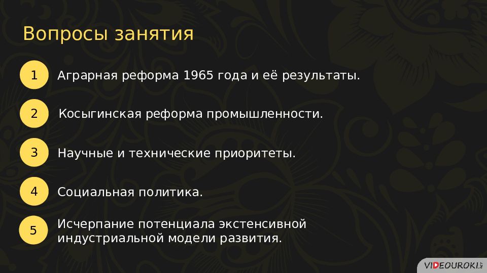 Вопросы занятия Аграрная реформа 1965 года и её результаты. 1 2 4 Косыгинская реформа промышленности. Социальная политика. 3 Научные и технические приоритеты. 5 Исчерпание потенциала экстенсивной индустриальной модели развития.