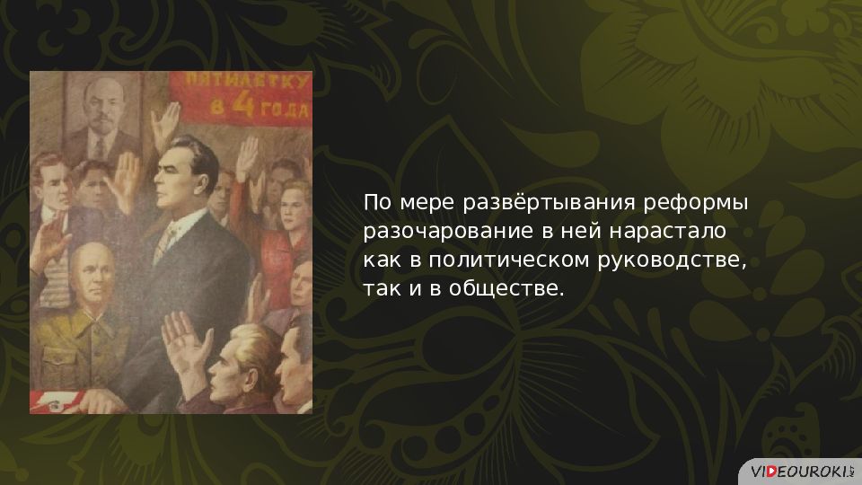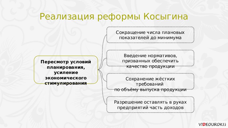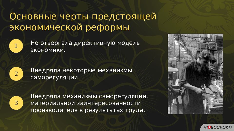 Основные черты предстоящей экономической реформы Не отвергала директивную модель экономики. 1 2 Внедряла некоторые механизмы саморегуляции. 3 Внедряла механизмы саморегуляции, материальной заинтересованности производителя в результатах труда.